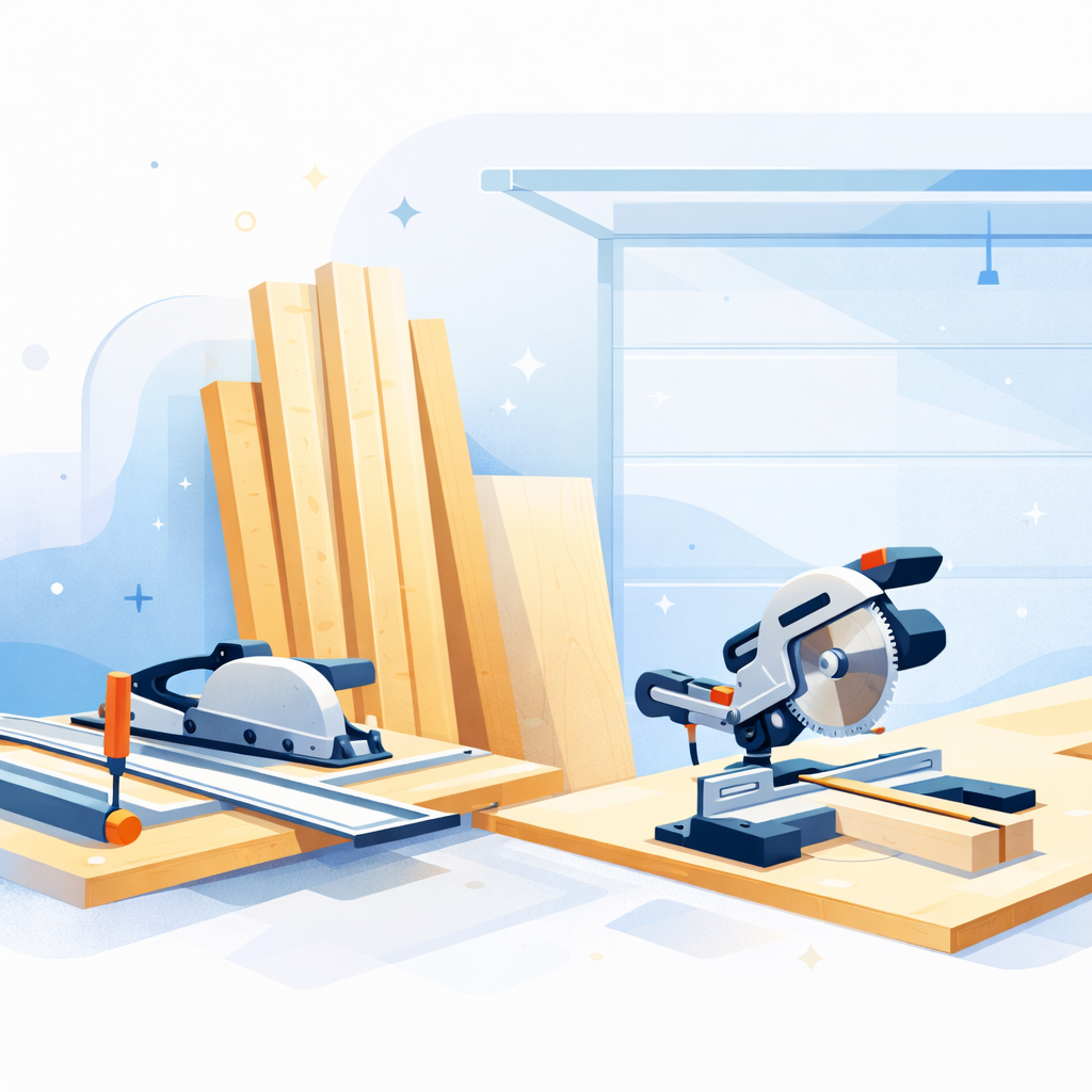 Zuschnitt von Holzplatten mit Tauchsäge und Führungsschiene beim Werkbankbau in der Garage